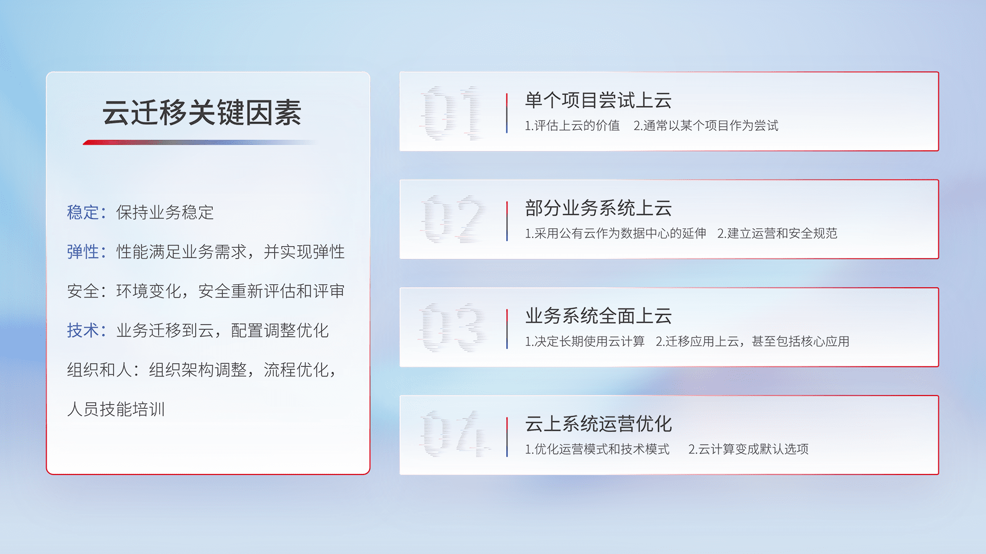 结合实际业务,,,从规划设计、、、云平台选型、、、、云原生改造、、数据迁移、、集成交付,,迁移全过程为客户识别最佳上云路径,,做好风险识别管理,,,设计网络架构、、、身份权限、、、、安全审计合规、、、、操作审计、、日志审计、、、、监控告警策略、、、多站点容灾设计等,,,对云上基础设施进行整体规划,,,,提升IT治理水平,,,以满足弹性、、、高可用、、、、高性能的需求。。。。