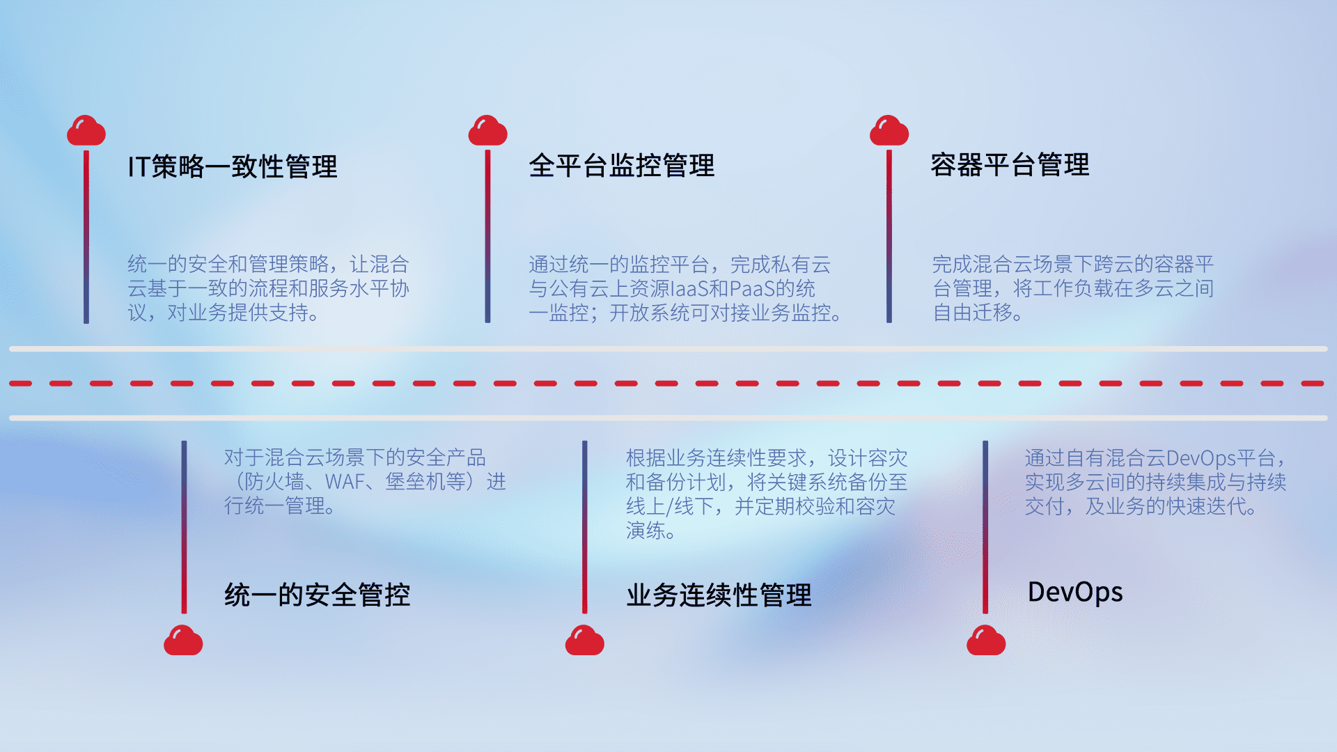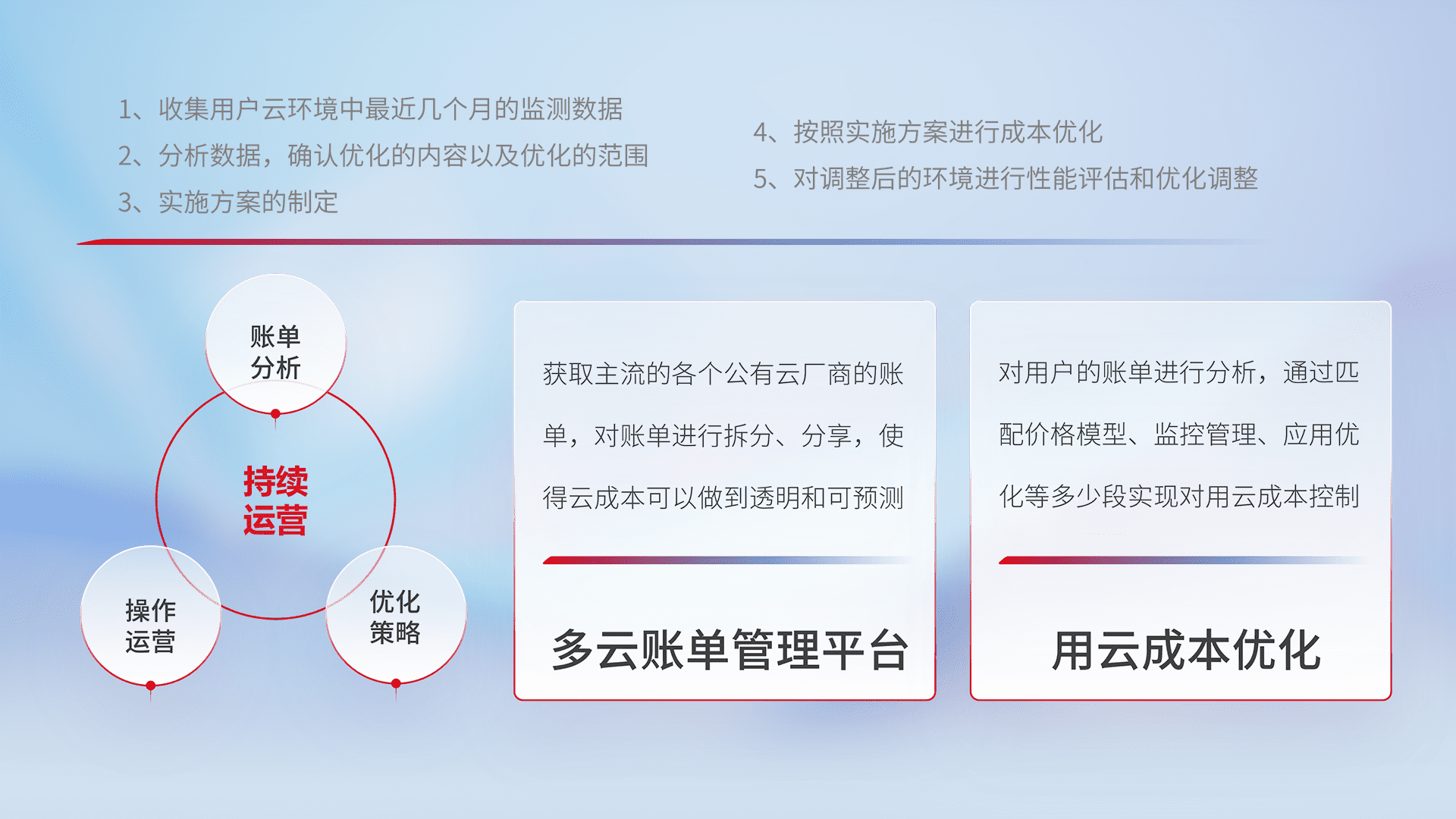 通过多云纳管,,,以统一的资源数据模型把客户的云资源进行抽象和封装,,进而实现对多云资源的统一操作,,,,保障云资源管理的可靠性、、、稳定性与可用性。。量身定制化运维内容,,配置、、、、开发运维、、、、补丁管理、、、备份、、监控、、认证和访问管理、、、审计和日常巡检等,,保障在用云过程中的可靠度,,稳定度以及高可用率。。