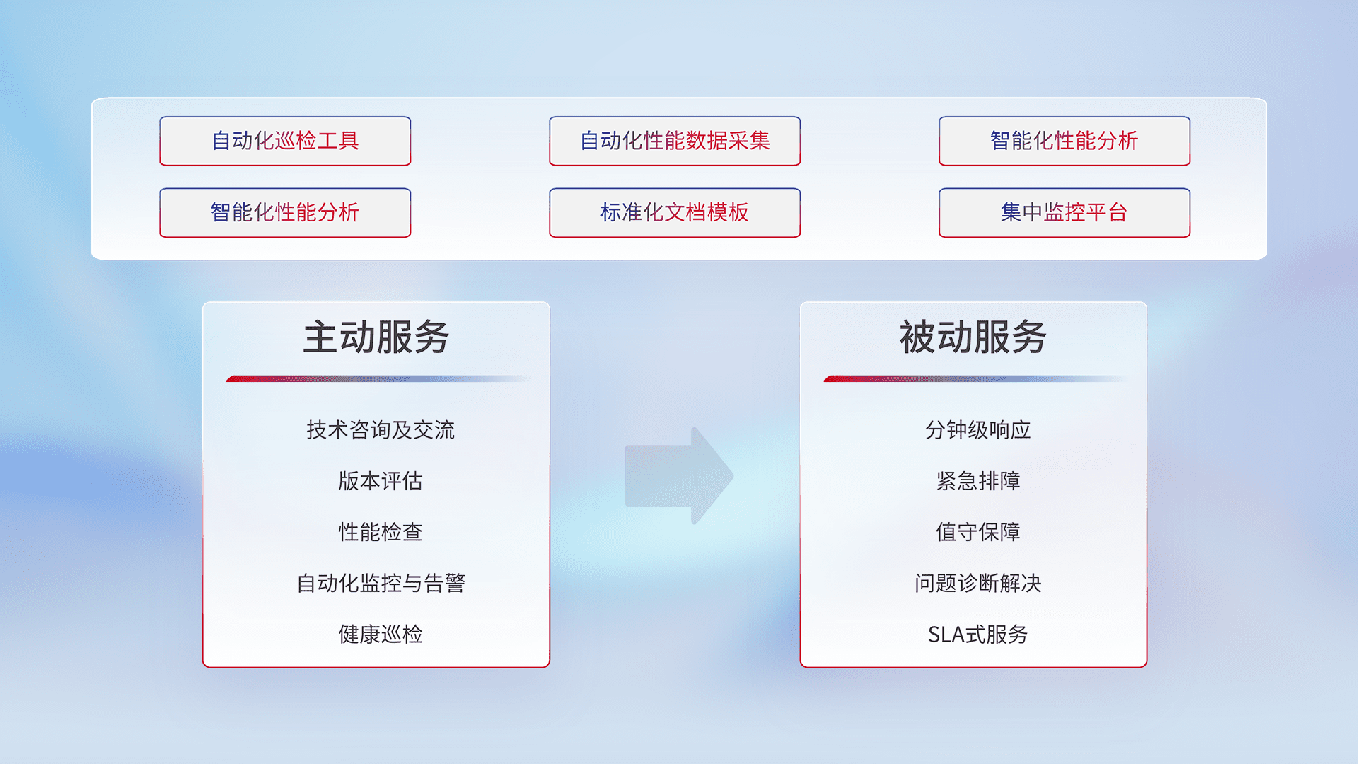 智能化工具和标准化文档,,保障服务质量,,,提供主动服务(包含技术咨询、、版本评估、、、性能检查、、、、自动化监控与告警、、健康巡检)和被动服务包含(分钟级响应、、紧急排障、、值守保障、、、问题诊断解决、、SLA服务)。。。。